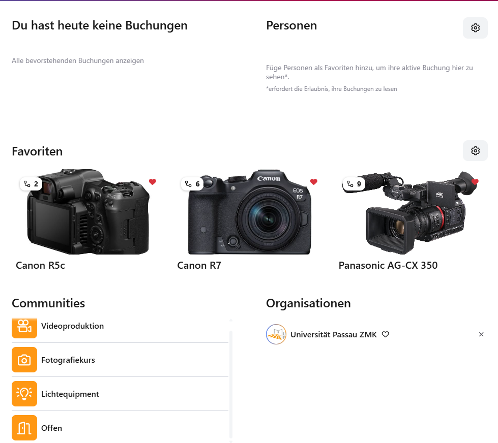 Für manche Geräte müssen Sie zuvor einen Kurs absolvieren. Nach erfolgreicher Teilnahme werden Sie im System freigeschaltet. Davon betroffen sind die Panasonic AG-CX 350, das Lichtequipment sowie die Canon-Kameras. Weitere Infos erhalten Sie in den FAQs.
