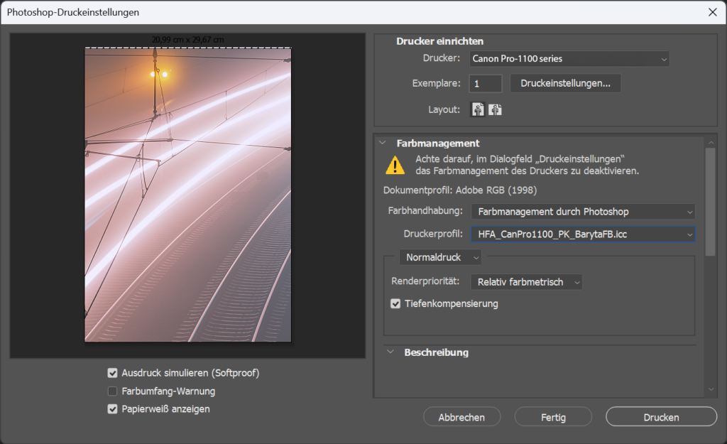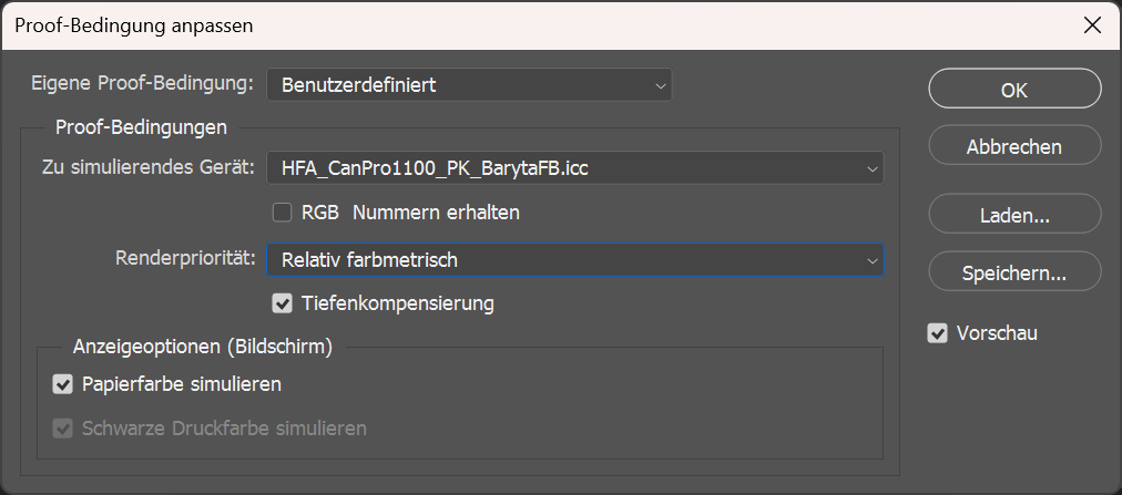In diesem Beispiel wurde das ICC-Profil „HFA_CanPro1100_PK_BarytaFB.icc“ von der Webseite von Hahnemühle heruntergeladen, installiert und im Dialogfeld ausgewählt.